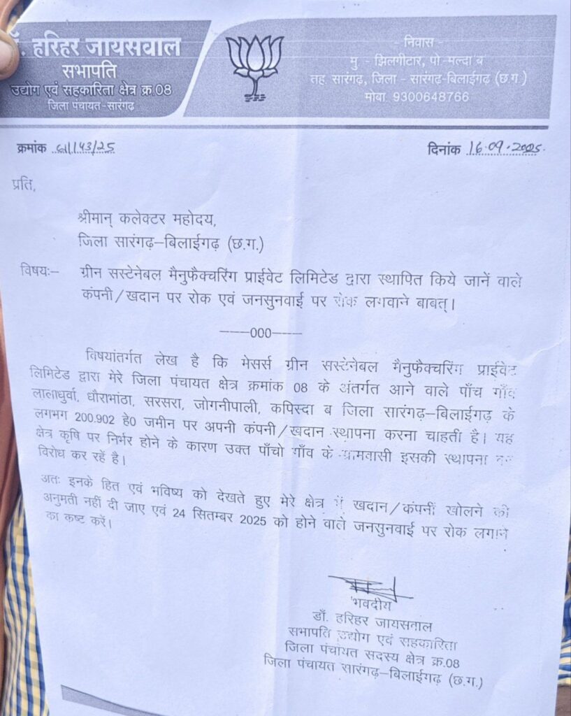 सारंगढ़ बिलाईगढ़ जिले के सारंगढ़ विकासखंड के अंतर्गत आने वाला ग्राम पंचायत धौराभाठा, सरसरा, जोगनीपाली, कपिसदा ब,लालाधुर्वा, इन पांचो गांव मे ग्रीन सस्टेनेबल मैनुफैक्चरिंग प्राईवेट लिमिटेड कंपनी द्वारा स्थापित किये जानें वाले कंपनी खदान का 24 सितम्बर 2025 में होने वाली जनसुनवाई पर रोक लगवाने के लिए आज सैकड़ो ग्रामीण कलेक्टर दफ़्तर पहुचे थे l