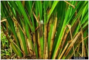 - शीथ ब्लाइट (चरपा) :- यह रोग धान में कंसे निकलने की अवस्था से गभोट की अवस्था तक देखा जा सकता है। रोग प्रकोपित खेत में पानी की सतह से आरम्भ होकर पर्णच्छद पर ऊपर की ओर फैलता है और अंततः पौधा रोगग्रस्त होकर झुलस जाता है। रोग लक्षण पर्णच्छद व पत्तियों पर दिखाई देते हैं। पर्णच्छद पर 2-3 से.मी. लम्बे, 0.5 से.मी. चौड़े भूरे से बदरंगे धब्बे बनते हैं। प्रारंभ में धब्बे का रंग हरा-मटमैला या ताम्र रंग का होता है। बाद में बीच का भाग मटमैला हो जाता है। इस रोग के नियंत्रण हेतु हेक्साकोनाजोल कवकनाशी (2 मि.ली. / ली.) या थायोफ्लूजामाइड का छिड़काव 10-12 दिन के अन्तर से करें।