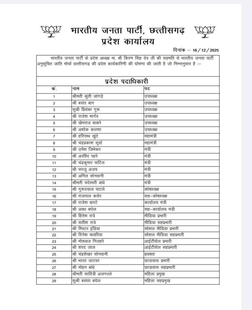 भारतीय जनता पार्टी के प्रदेश अध्यक्ष किरण देव सिंह की सहमति से भाजपा अनुसूचित जाति मोर्चा, छत्तीसगढ़ की प्रदेश कार्यकारिणी की घोषणा कर दी गई है। इस घोषणा में सारंगढ़–बिलाईगढ़ जिले को संगठनात्मक दृष्टि से महत्वपूर्ण प्रतिनिधित्व प्राप्त हुआ है।